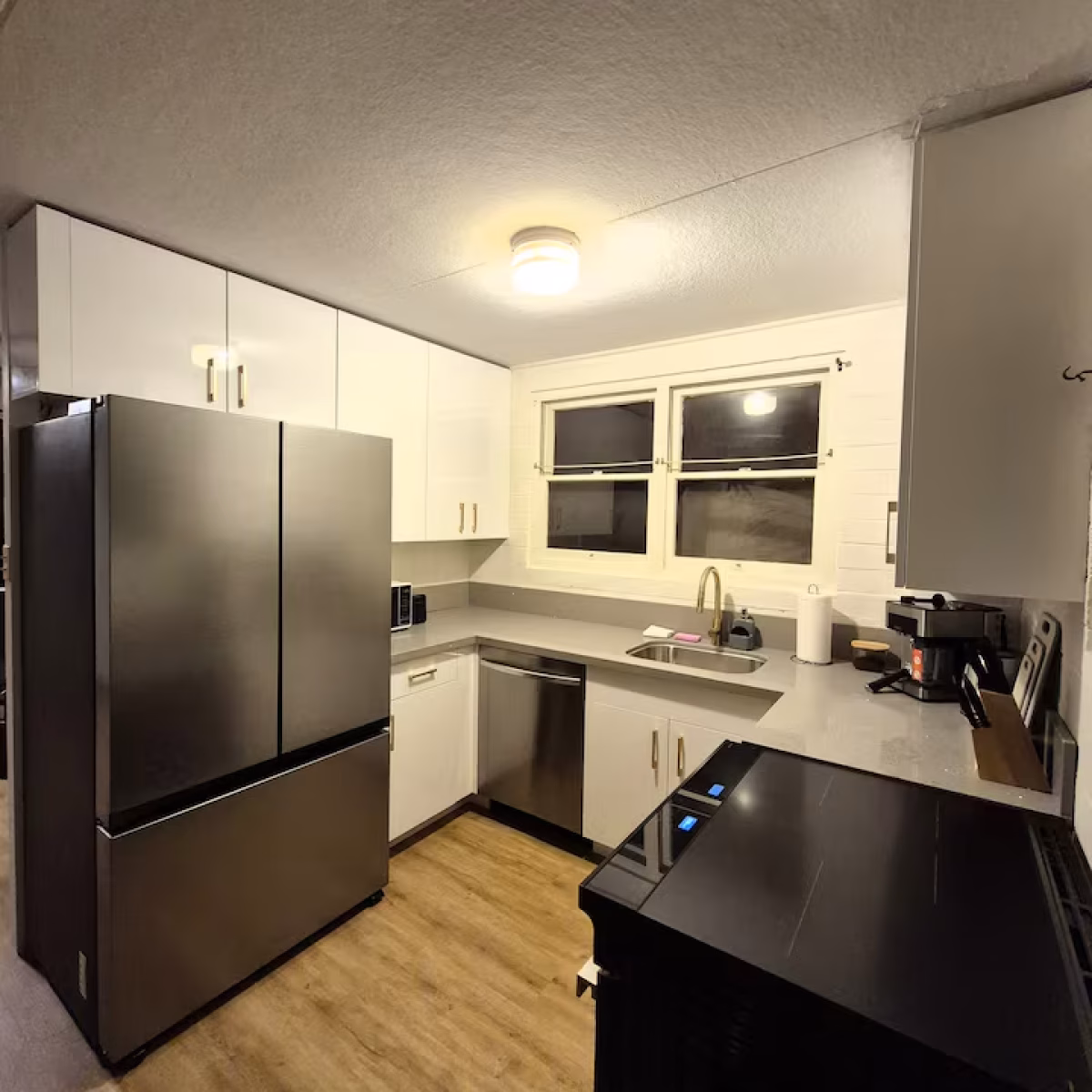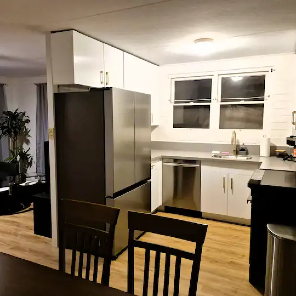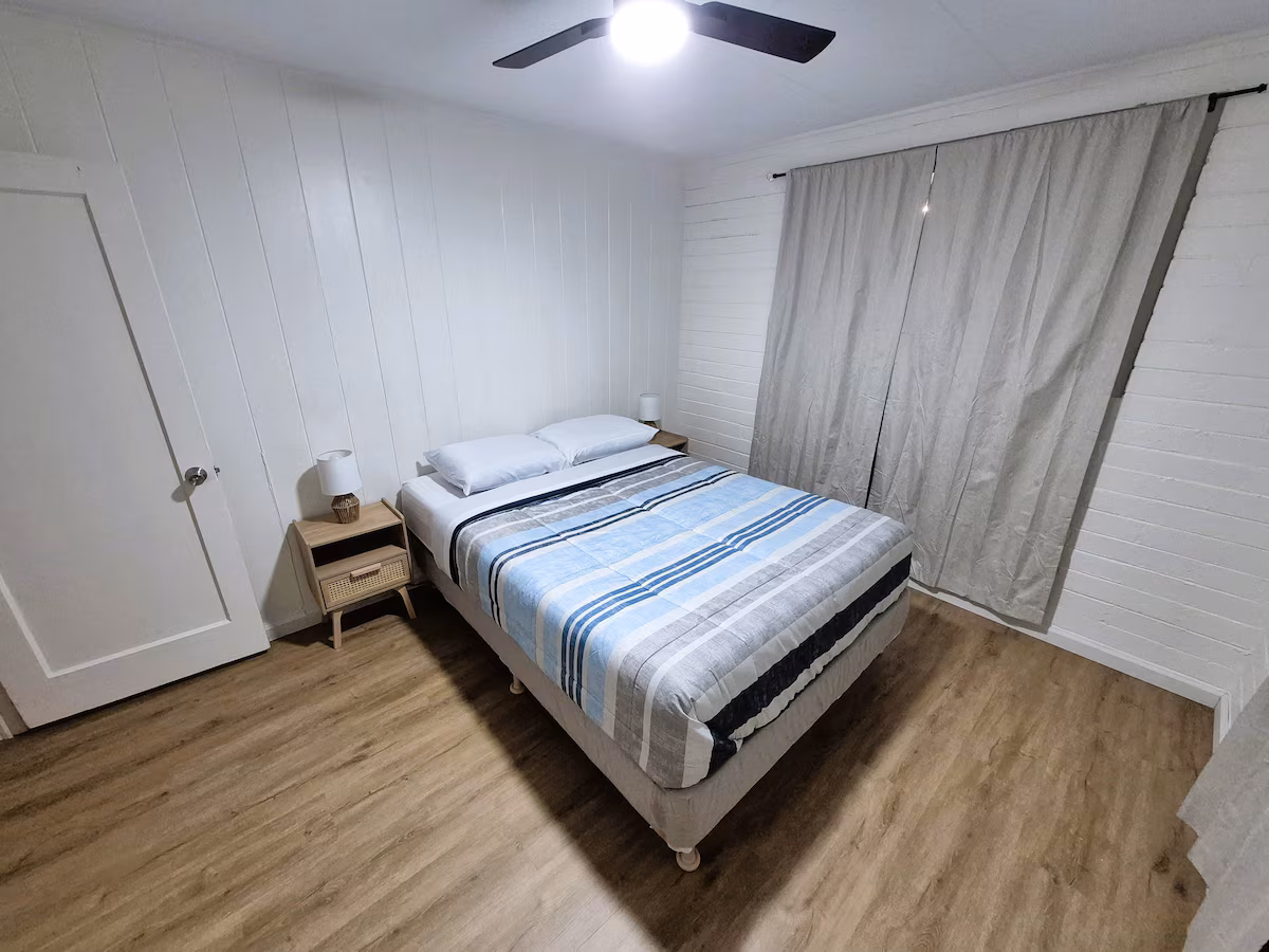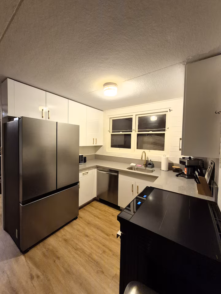 The house features a bright open living area, a modern kitchen, cozy bedrooms and a private fenced yard. Guests also have access to parking, as well as a washer and dryer for everyday convenience.